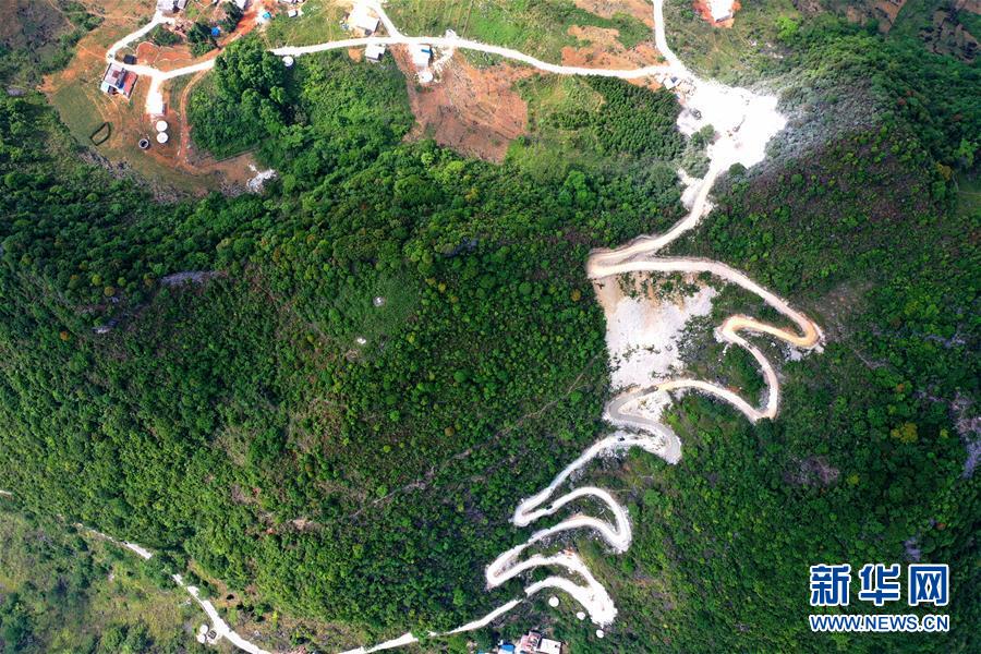 這是在進(jìn)行路面硬化的大化瑤族自治縣弄合村弄魯屯至弄確屯的山路(5月13日攝,無人機(jī)照片)。新華社記者周華攝