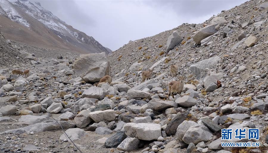 前往海拔5800米珠峰過渡營地路上的巖羊(5月19日攝)。新華社記者晉美多吉攝