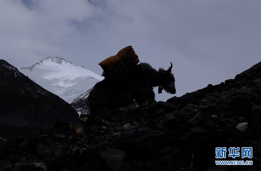 牦牛運輸隊向海拔5800米的過渡營地運輸物資(5月19日攝)。新華社記者晉美多吉攝
