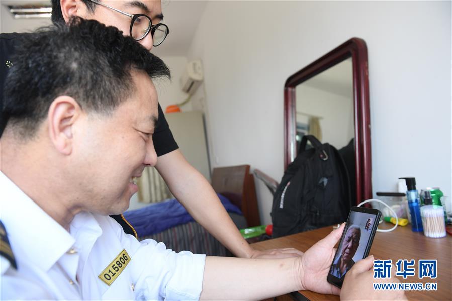 5月20日,在寧波七里嶼,前來運送物資的葉家第四代燈塔工葉靜虎(前)和兒子葉超群在宿舍內(nèi)跟第三代燈塔工葉中央視頻通話。葉超群自2013年起在七里嶼燈塔工作,葉靜虎從燈塔工崗位上退下來后,目前在寧波航標處后勤事務(wù)中心工作。新華社記者翁忻旸攝