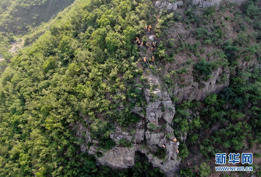 5月21日,捅山工胡軍從山頂垂降,準(zhǔn)備開(kāi)始捅山作業(yè)。新華社記者郝源攝