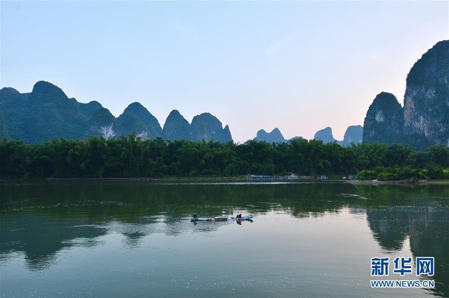 這是在廣西桂林市陽朔縣興坪鎮(zhèn)拍攝的山水風光(5月19日攝)?!吧n蒼森八桂,茲地在湘南。江作青羅帶,山如碧玉篸……”一千多年前,唐朝詩人韓愈寫盡桂林山水之美。初夏時節(jié),在廣西桂林市陽朔縣興坪鎮(zhèn),藍天白云下,煙雨朦朧中,桂林山水盡顯秀美。新華社記者 崔博文 攝
