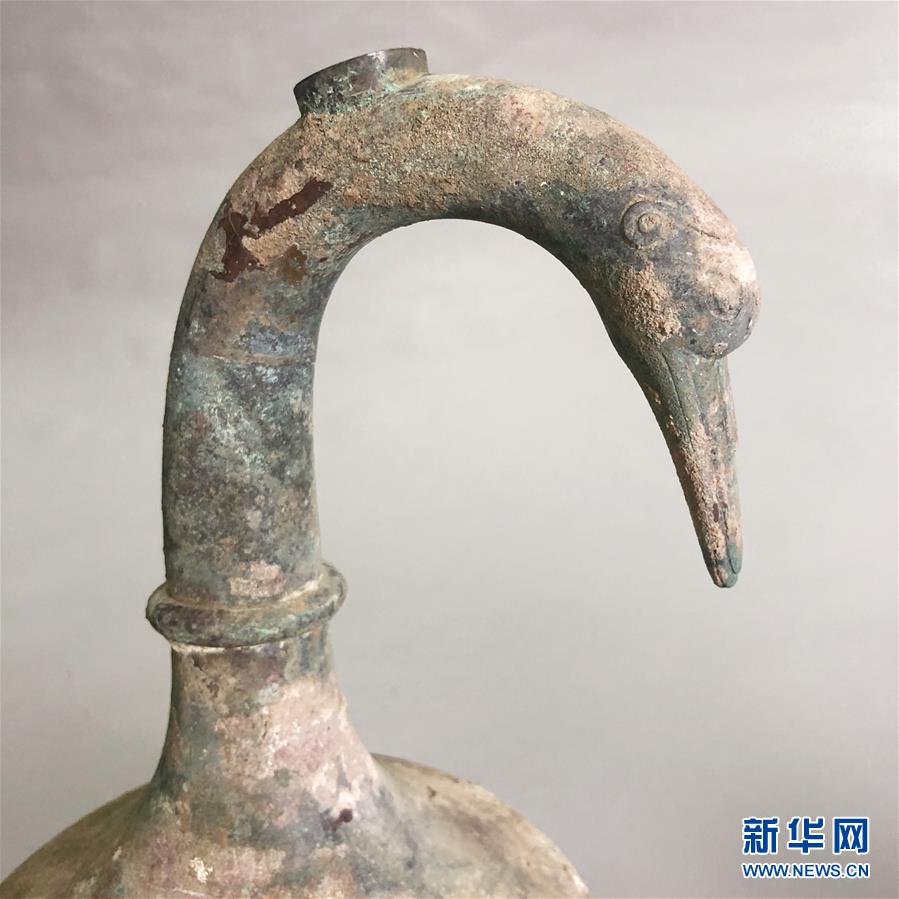 新華社鄭州5月23日電(記者李麗靜)河南省三門(mén)峽市文物考古研究所的考古工作者近日在當(dāng)?shù)匾粋€(gè)發(fā)掘現(xiàn)場(chǎng),發(fā)現(xiàn)一個(gè)鵝首曲頸青銅壺。頂部的鵝首造型姿態(tài)優(yōu)美,壺中還存有不明液體逾3000ml。