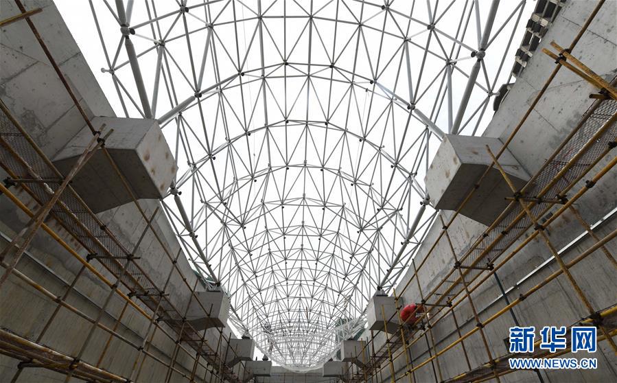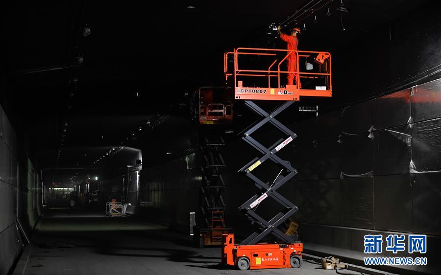 5月23日,工人在海口文明東越江通道項目隧道內安裝照明設備。新華社記者楊冠宇攝