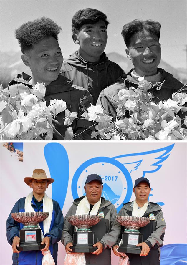 拼版照片:上圖為1960年6月7日,人類歷史上首次從北坡登頂珠峰的中國登山隊(duì)隊(duì)員王富洲(右)、貢布(中)與屈銀華三人凱旋拉薩后捧花合影(資料照片)。新華社發(fā)下圖為2017年7月12日,在紀(jì)念西藏登山隊(duì)成功登頂世界14座海拔8000米以上高峰10周年儀式上,隊(duì)員次仁多吉(中)、邊巴扎西(左)和洛則獲頒紀(jì)念獎杯。新華社記者普布扎西攝