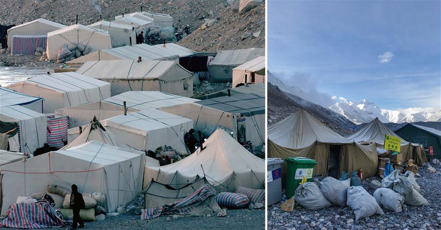 拼版照片:左圖為2005年的春季登山季,為測量、登山和科考等隊伍提供服務(wù)保障的當(dāng)?shù)厝罕娫谥榉宕蟊緺I搭起的帳篷(資料照片)。新華社記者索朗羅布攝右圖為2020珠峰高程測量活動中,曾經(jīng)被視為登山隊最好的帳篷變成了垃圾集中存放處。新華社記者普布扎西攝