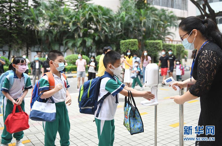 5月25日,廣州市荔灣區(qū)蔣光鼐紀(jì)念小學(xué)的老師在校門口為返校學(xué)生檢測(cè)體溫。當(dāng)日,廣州市各小學(xué)一至三年級(jí)學(xué)生正式開學(xué)復(fù)課。至此,廣州市中小學(xué)各年級(jí)已全部開學(xué)復(fù)課。新華社記者盧漢欣攝
