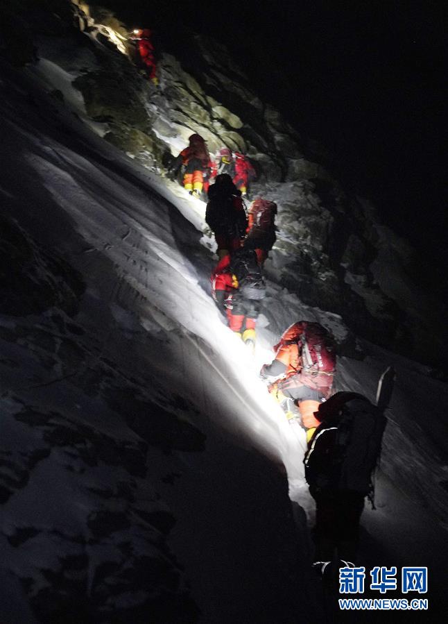 5月27日,2020珠峰高程測(cè)量登山隊(duì)正在向珠峰峰頂挺進(jìn)。當(dāng)日2時(shí)10分許,2020珠峰高程測(cè)量登山隊(duì)8名隊(duì)員陸續(xù)從海拔8300米的突擊營地出發(fā),向著世界海拔最高的珠峰峰頂挺進(jìn)。新華社特約記者扎西次仁攝