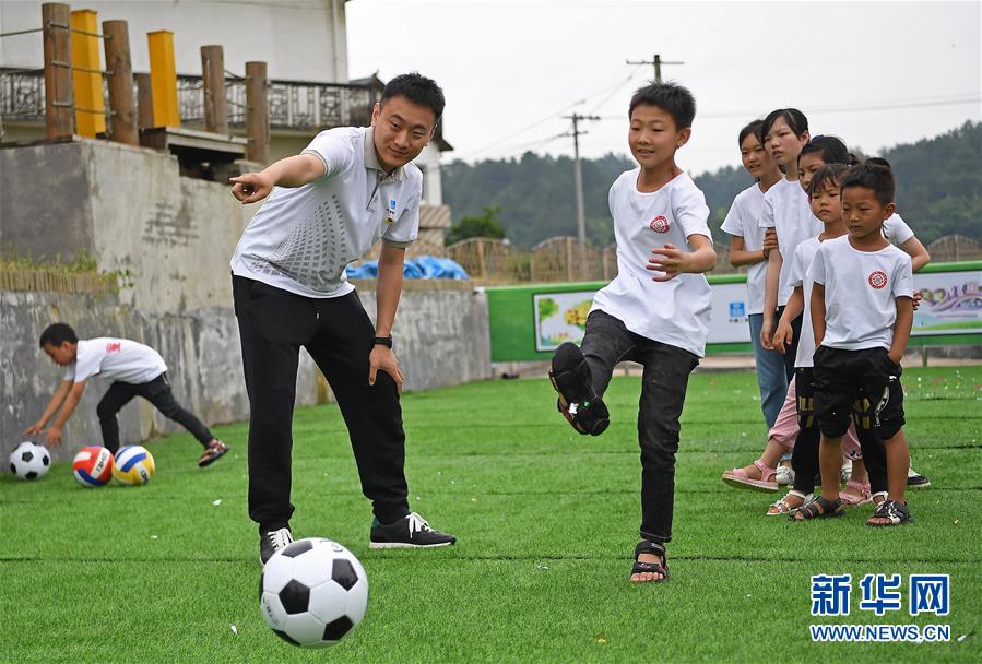 5月27日,在江西省貴溪市金屯鎮(zhèn)金屯村渡坊村小組,志愿者和留守兒童一起進行體育活動。新華社記者萬象攝