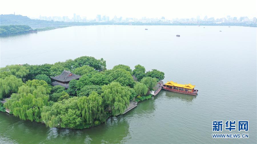 5月27日,船只在西湖湖心亭附近行駛(無人機照片)。隨著氣溫升高,杭州西湖綠意蔥蘢,展現(xiàn)出柔美的湖光山色。新華社記者翁忻旸攝