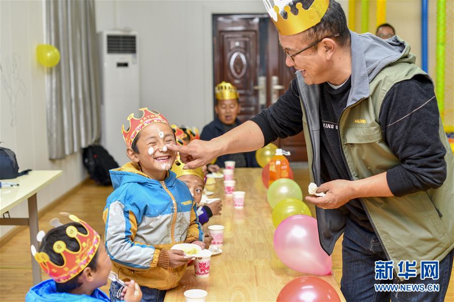 5月27日,玉麥鄉(xiāng)小學(xué)校長(zhǎng)朗杰和孩子們一起慶祝“生日”。新華社記者王炳坤攝