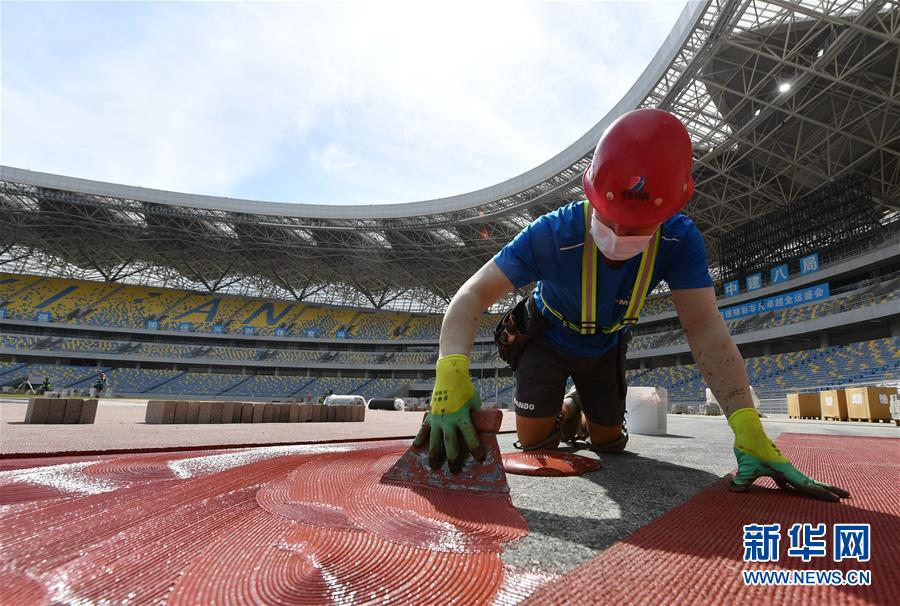 5月29日,工人在西安奧體中心體育場鋪設(shè)跑道。新華社記者張博文攝