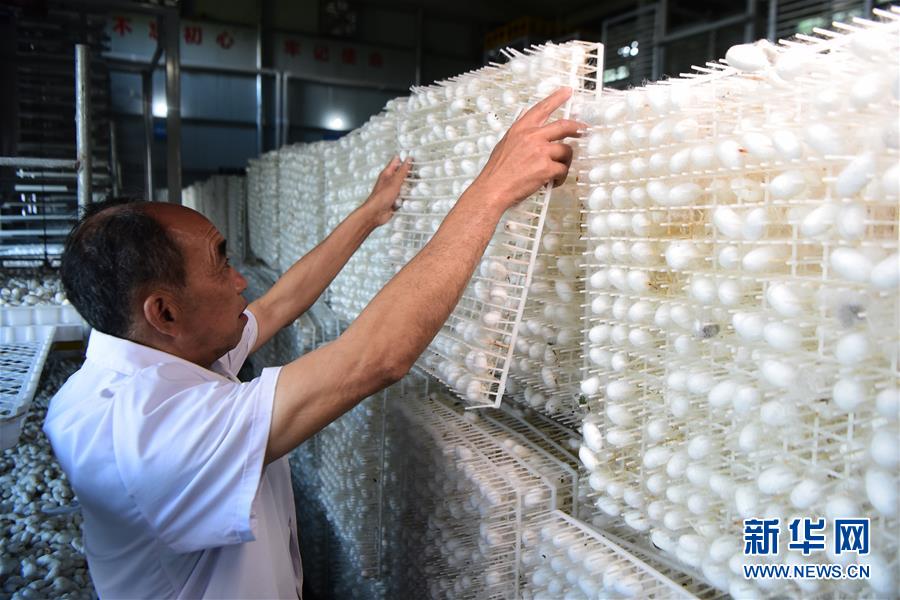 5月29日,奉節(jié)縣新民鎮(zhèn)中嶺村蠶桑產(chǎn)業(yè)扶貧基地工作人員在智慧蠶房內(nèi)晾曬蠶繭。新華社記者 王全超 攝