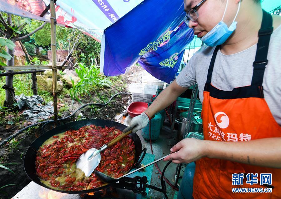 5月30日,廚師在龍蝦狂歡節(jié)現(xiàn)場烹制小龍蝦。新華社記者徐昱攝