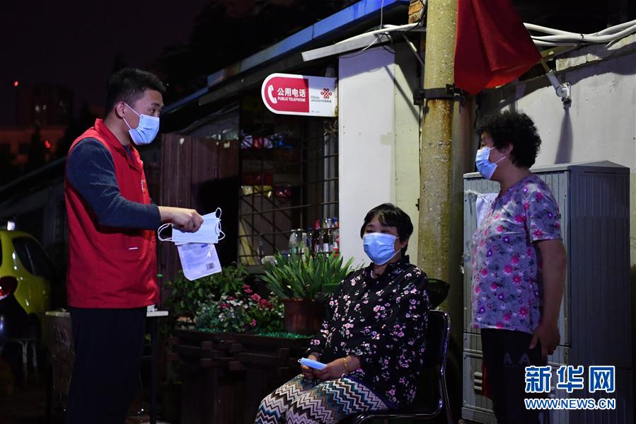 楊龍明在小區(qū)內給住戶發(fā)放口罩(6月1日攝)。新華社記者李然攝。
