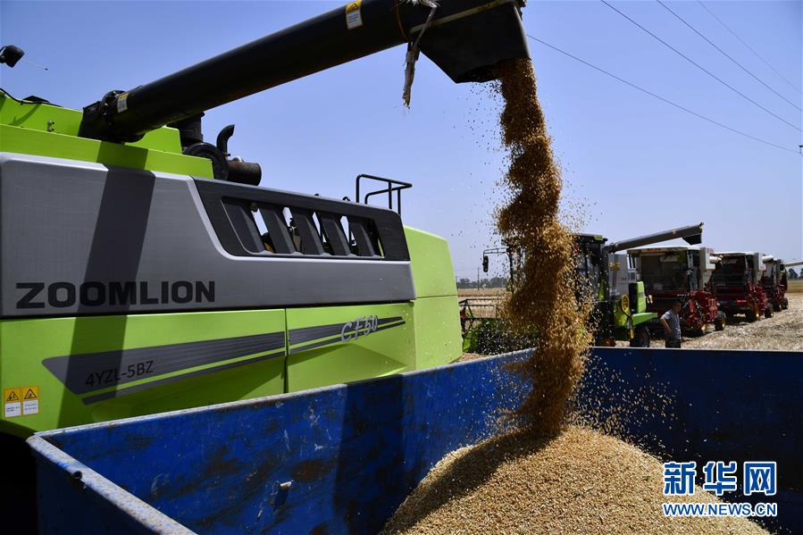 6月3日,收割機在汶上縣郭倉鎮(zhèn)的麥田里收獲小麥。目前,我國第二大小麥主產(chǎn)區(qū)山東6000多萬畝小麥進(jìn)入收獲階段。農(nóng)民們搶抓有利天氣,自南向北陸續(xù)開鐮。新華社記者郭緒雷攝。