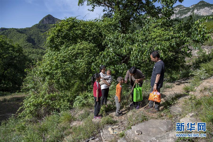 秦春蘭(左二)、秦秋蘭(左一)和秦興旺(右三)在南背村迎接老師們的到來(lái)(5月31日攝)。新華社記者楊晨光攝。