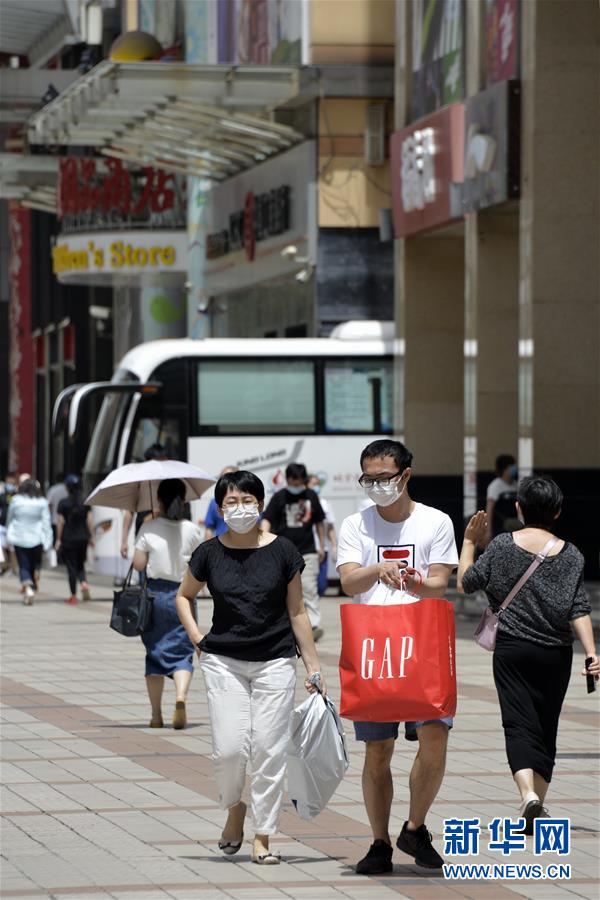 6月3日,市民及游客在王府井步行街購物。近日,游人和市民紛紛來到北京市的王府井、西單、前門大街等著名商業(yè)街購物休閑,這些老商業(yè)街開始逐步恢復(fù)昔日的繁華。新華社記者李欣攝。
