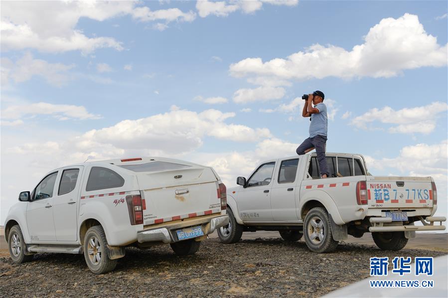 在新疆卡拉麥里山有蹄類野生動物自然保護(hù)區(qū),管護(hù)員阿達(dá)比亞特在觀察遠(yuǎn)處水源地蓄水情況(6月3日攝)。新華社記者丁磊攝。