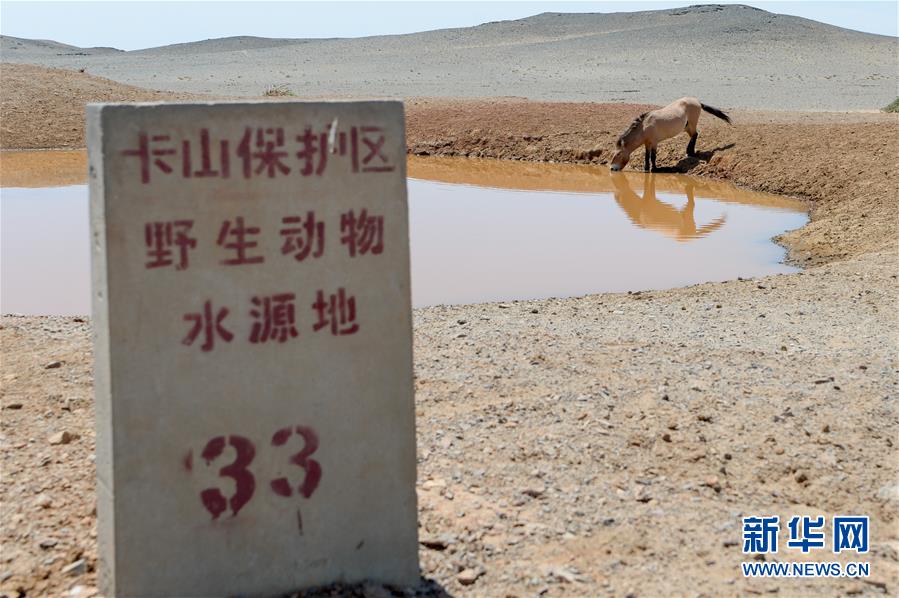 在新疆卡拉麥里山有蹄類野生動物自然保護(hù)區(qū),一匹普氏野馬來到33號水源地飲水(6月3日攝)。新華社記者丁磊攝。
