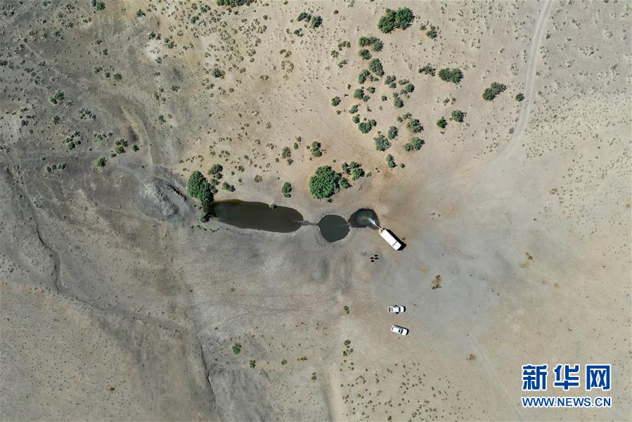 在新疆卡拉麥里山有蹄類野生動物自然保護(hù)區(qū),管護(hù)員為水源地灌水(6月3日攝,無人機(jī)照片)。新華社記者丁磊攝。