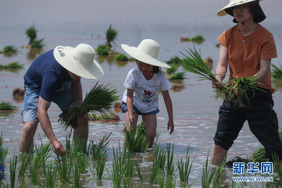 6月7日,孩子和家長(zhǎng)在稻田里插秧。