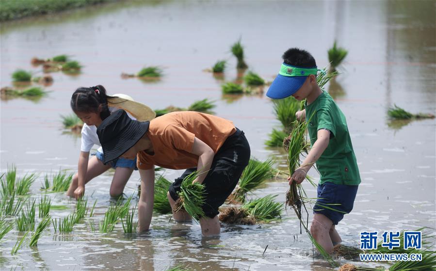 6月7日,孩子和家長體驗稻田插秧。新華社記者徐昱攝