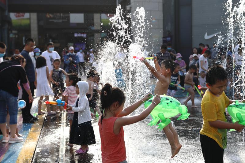 2020年6月7日,北京,華西熙LIVE的噴泉水池成為孩童的戲水降暑天堂。北京6日下午發(fā)高溫藍色預警,預計6月7日至8日,北京大部分地區(qū)日最高氣溫達36℃以上。