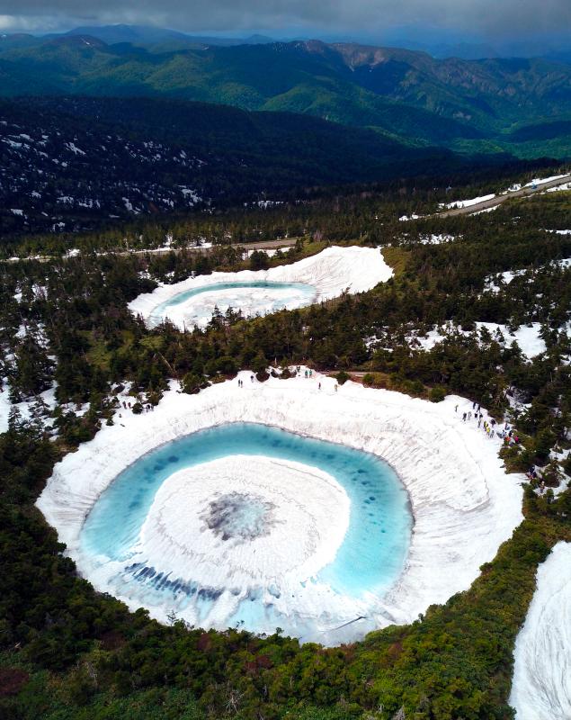 當?shù)貢r間2020年6月8日,日本,在橫跨巖手縣與秋田縣的八幡平山頂附近的“鏡沼”,伴隨著“鏡沼”的積雪從外側(cè)逐漸融化,外圍的碧藍色湖水與中心部的潔白積雪相映成趣,呈現(xiàn)出獨特的類似“龍眼”的景象。據(jù)悉,八幡平“龍眼”奇景只在每年5月下旬至6月初的雪融期間短暫出現(xiàn)。