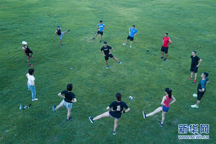 6月11日,??谝患遗軋F(tuán)負(fù)責(zé)人張雪怡(右)在夜跑結(jié)束后帶領(lǐng)跑團(tuán)成員做拉伸運(yùn)動(dòng)。近年來,夜跑成為越來越多都市人熱衷的健身方式之一。在海南???,每當(dāng)夜幕降臨,“夜跑族”來到海口萬綠園、世紀(jì)公園等夜跑場所跑步,用一身酣暢淋漓的汗水?dāng)[脫白天工作中的壓力,享受跑步帶來的歡愉。新華社記者 蒲曉旭 攝