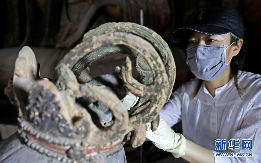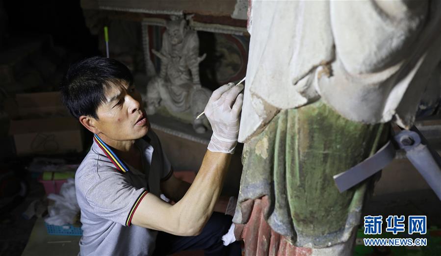 6月8日,工作人員對奉國寺的彩繪泥塑進(jìn)行保護(hù)修復(fù)。新華社記者 姚劍鋒 攝