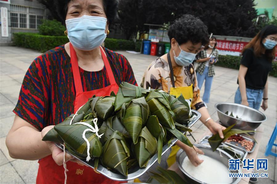 6月17日,水清溝街道居民在社區(qū)廣場(chǎng)上包粽子。新華社記者 李紫恒 攝