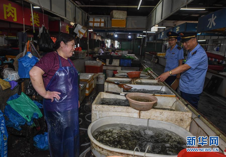 6月17日,市場監(jiān)管執(zhí)法人員在東林鎮(zhèn)農(nóng)貿(mào)市場開展專項執(zhí)法行動,檢查是否存在非法銷售野生動物的情況。新華社記者 徐昱 攝