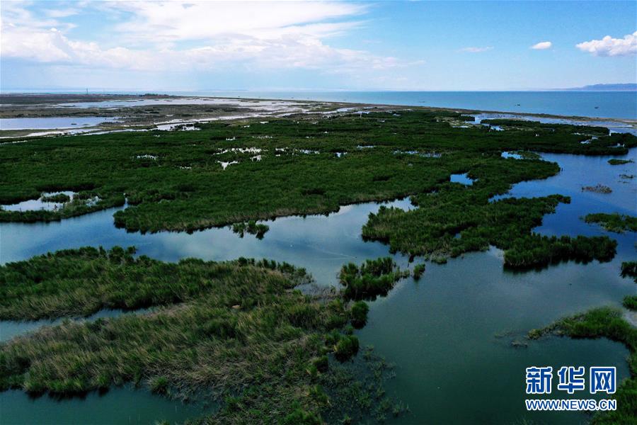 6月19日拍攝的新疆烏倫古湖國家濕地公園(無人機(jī)照片)。烏倫古湖國家濕地公園位于新疆阿勒泰地區(qū)福??h城以西,由烏倫古湖和吉力湖兩部分組成。烏倫古湖濕地公園是遷徙候鳥飛越天山和阿爾泰山的“能量補(bǔ)充站”,良好的濕地生態(tài)吸引著大量遷徙鳥類在此集結(jié)成群,繁殖棲息,成為一道靚麗的風(fēng)景線。新華社記者 沙達(dá)提 攝