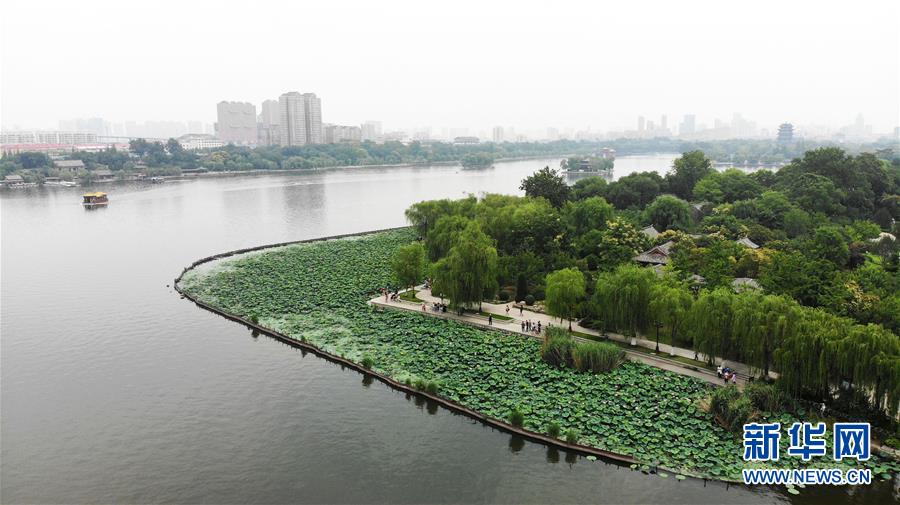 6月19日拍攝的大明湖畔的荷花池(無人機照片)。近日,山東濟南大明湖的荷花陸續(xù)綻放,吸引游客前來觀賞。新華社記者 王凱 攝