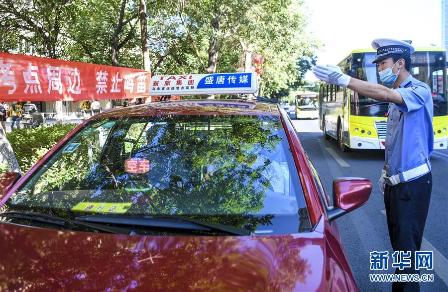 6月20日,在烏魯木齊市第十一中學(xué)門前,烏魯木齊市公安局交警支隊天山區(qū)大隊新華路中隊警官肖健波提醒過往車輛減速慢行、禁止鳴笛。當(dāng)日,烏魯木齊市初中升高中考試開始。為保障為期三天的中考順利進(jìn)行,烏魯木齊市公安局交警支隊在各考點執(zhí)勤,為考生保駕護(hù)航新華社記者 王菲 攝