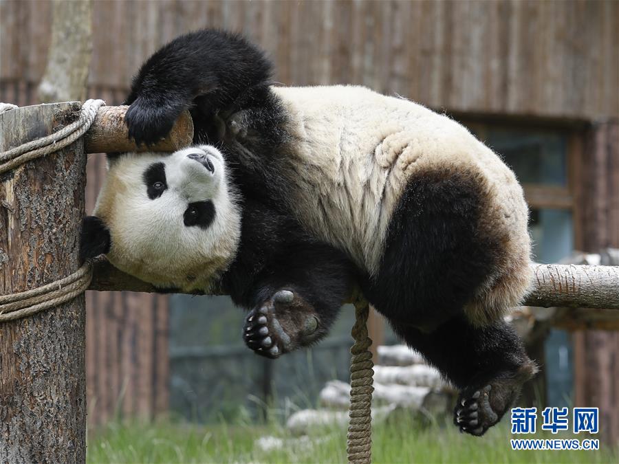 在位于四川省阿壩藏族羌族自治州的九寨溝大熊貓園,大熊貓“新新”在玩耍(6月19日攝)。新華社記者沈伯韓攝