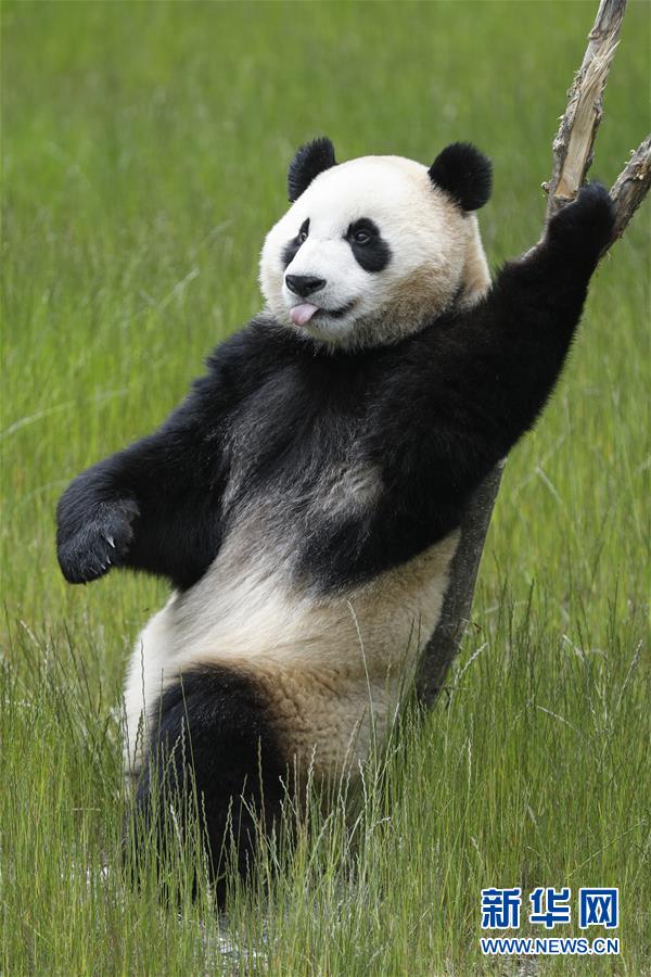 在位于四川省阿壩藏族羌族自治州的九寨溝大熊貓園,大熊貓“海?!痹谕嫠#?月19日攝)。新華社記者沈伯韓攝