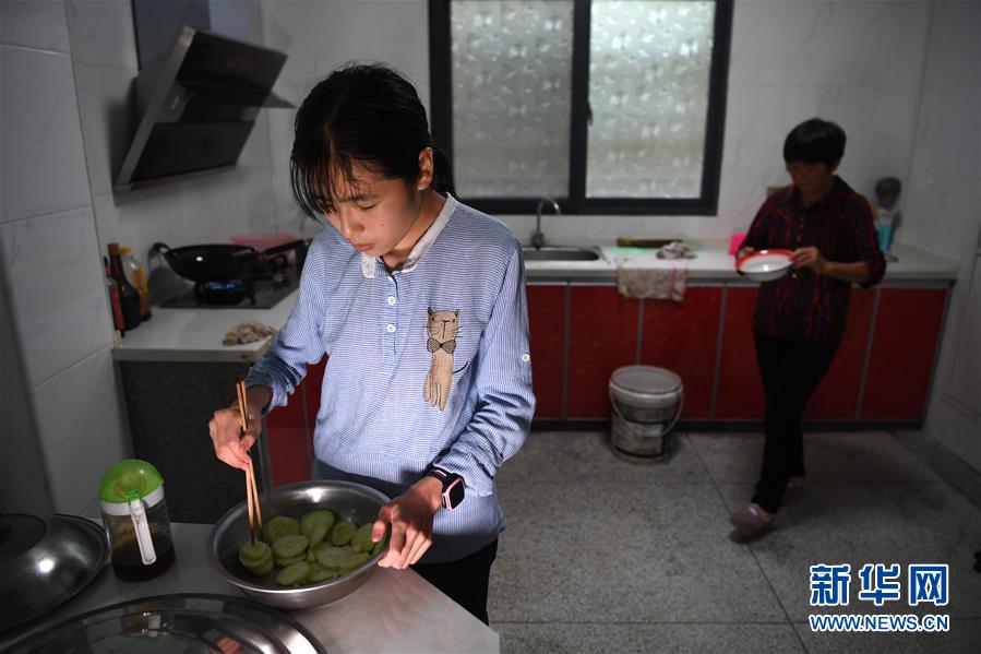 6月19日,蔡齊艷在家里幫媽媽準(zhǔn)備晚餐。新華社記者劉軍喜攝