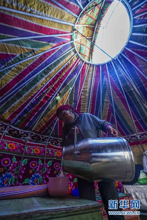在吉木乃縣萬駝園內(nèi),一位牧民將一部分駝奶倒出留作自己食用(6月21日攝)。新華社記者趙戈攝