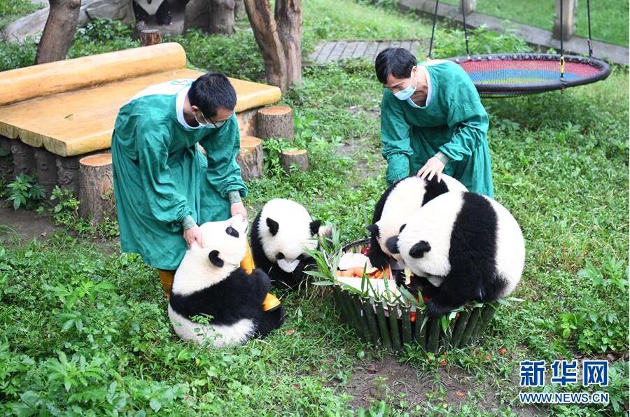 當(dāng)日,重慶動物園為4只大熊貓“雙雙”“重重”“喜喜”“慶慶”舉行周歲生日慶?;顒?。4只大熊貓在重慶動物園熊貓館運(yùn)動場內(nèi)玩耍嬉戲,享用市民游客為它們親手制作的“生日蛋糕”。