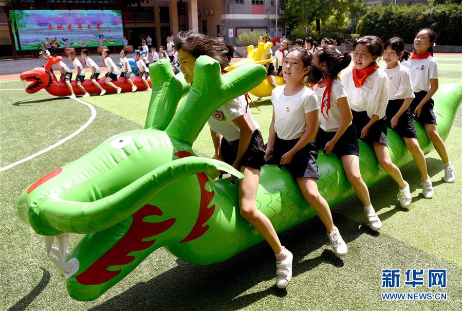 6月24日,西安市新城區(qū)后宰門小學(xué)的學(xué)生在進(jìn)行旱地龍舟比賽。端午節(jié)臨近,各地舉行包粽子、做香包、賽龍舟等豐富多彩的民俗文化活動(dòng),迎接傳統(tǒng)佳節(jié)的到來。新華社記者劉瀟攝