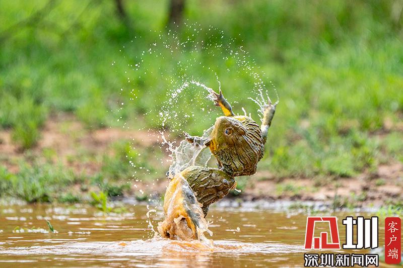 2020年6月30日?qǐng)?bào)道(具體拍攝時(shí)間不詳),南非波羅克瓦克,兩只雄性非洲牛蛙為了爭(zhēng)奪雌性牛蛙,在池塘中打架,這樣的情形十分罕見(jiàn)。畫(huà)面中,戰(zhàn)況十分激烈,一只非洲牛蛙在另外一只試圖逃到池塘邊緣時(shí)撕咬對(duì)手,甚至將另外一只拋向空中。這些精彩的照片是由南非開(kāi)普敦?cái)z影師Temujin Johnson拍攝的。