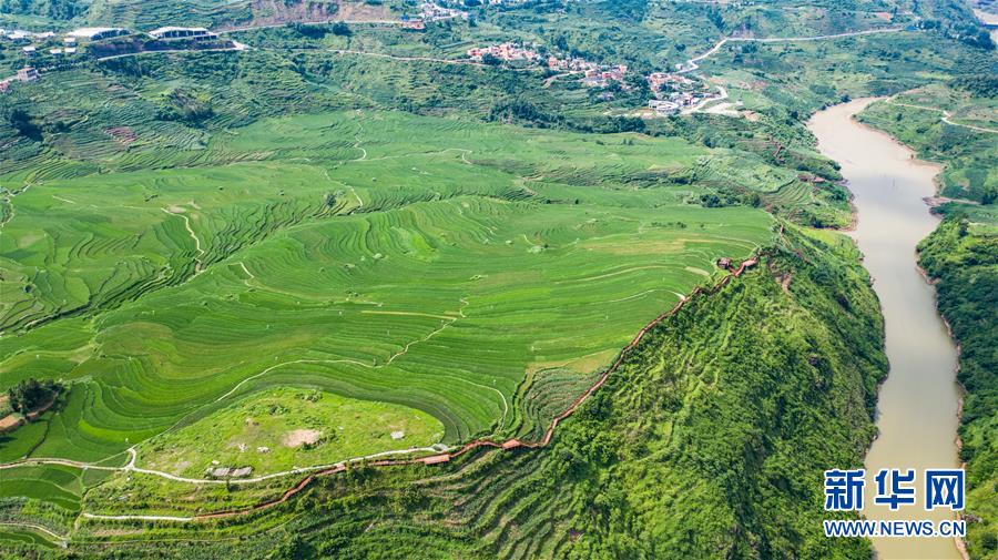貴州省盤州市新民鎮(zhèn)的梯田風(fēng)光(6月29日攝,無(wú)人機(jī)照片)。夏日時(shí)節(jié),貴州省盤州市新民鎮(zhèn)的梯田風(fēng)景如畫。新華社記者陶亮攝