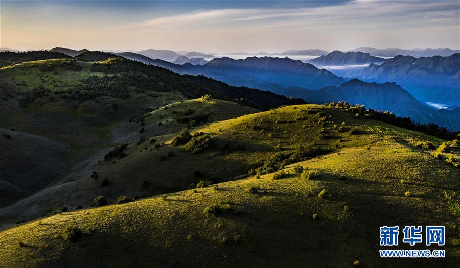 6月30日,朝霞照耀下的神田草甸(無人機照片)。位于陜西省安康市嵐皋縣與重慶市城口縣交界處大巴山神田主脊北坡的神田草甸,面積超過1.1萬畝。夏日的朝霞中,起伏的草甸仿佛一塊寬大無邊的綠色地毯,鑲嵌在大巴山上,如詩如畫。新華社發(fā)(邱仕君攝)