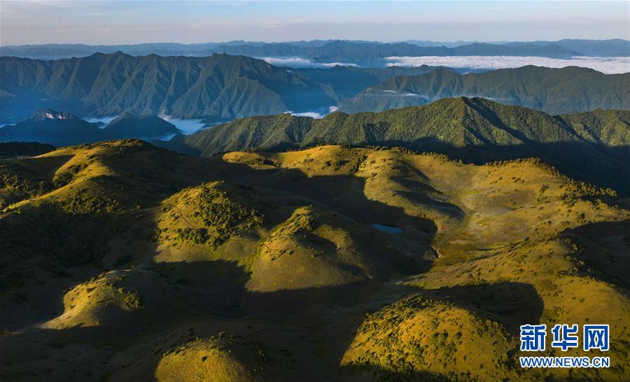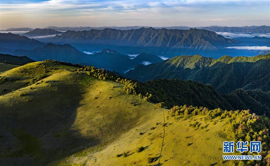 6月30日,朝霞照耀下的神田草甸與遠(yuǎn)處的群峰(無人機照片)。位于陜西省安康市嵐皋縣與重慶市城口縣交界處大巴山神田主脊北坡的神田草甸,面積超過1.1萬畝。夏日的朝霞中,起伏的草甸仿佛一塊寬大無邊的綠色地毯,鑲嵌在大巴山上,如詩如畫。新華社記者陶明攝