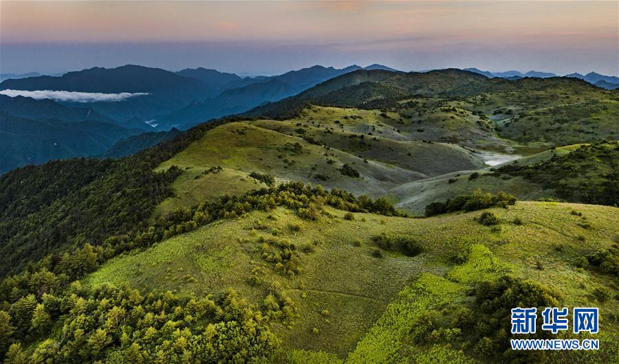 6月30日,朝霞照耀下的神田草甸(無人機照片)。位于陜西省安康市嵐皋縣與重慶市城口縣交界處大巴山神田主脊北坡的神田草甸,面積超過1.1萬畝。夏日的朝霞中,起伏的草甸仿佛一塊寬大無邊的綠色地毯,鑲嵌在大巴山上,如詩如畫。新華社記者陶明攝