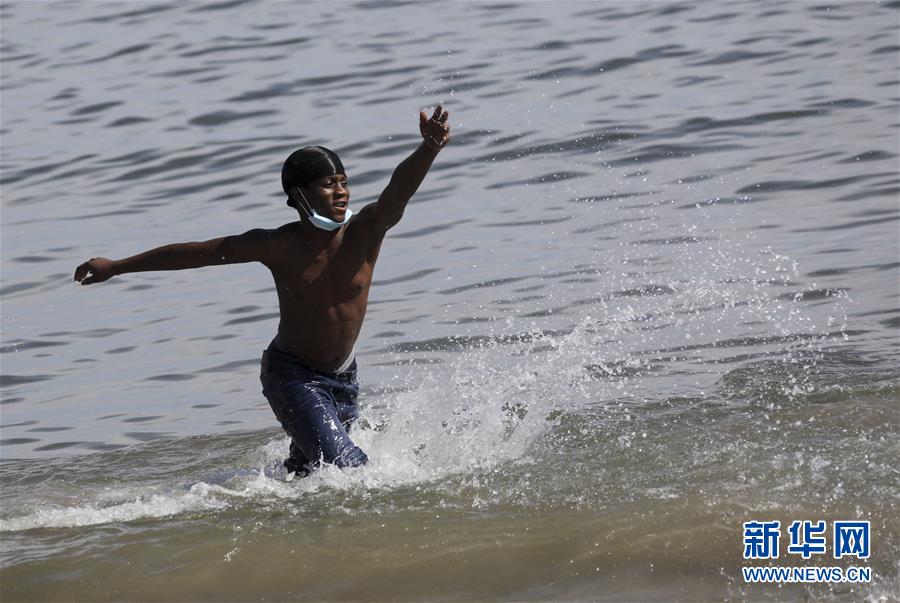 7月1日,人們?cè)诿绹~約科尼島戲水。當(dāng)日,美國紐約市屬八處海灘正式重新準(zhǔn)許民眾游泳,救生員也同時(shí)上崗。新華社記者王迎攝