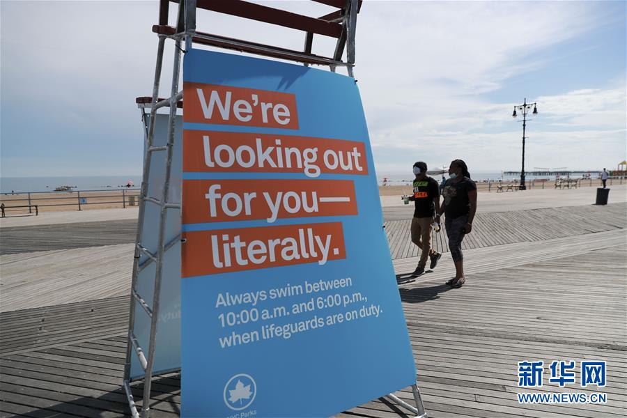 這是7月1日在美國紐約科尼島一處海灘上拍攝的關(guān)于允許游泳時間的提示牌。當(dāng)日,美國紐約市屬八處海灘正式重新準(zhǔn)許民眾游泳,救生員也同時上崗。新華社記者王迎攝