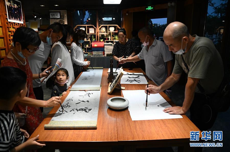 游客在洛陽(yáng)市洛邑古城的汝陽(yáng)劉毛筆店內(nèi)參觀體驗(yàn)(6月29日攝)。新華社記者 張浩然 攝